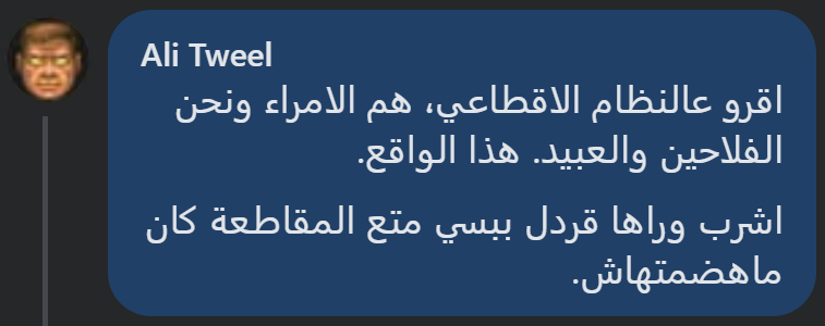 حين كتبتُ تعليقًا قلت فيه: “اقروا عن النظام الإقطاعي… هم الأمراء ونحن الفلاحين والعبيد.” كثيرون ضحكوا، وكثيرون قالوا: فيه شيء من الحقيقة.